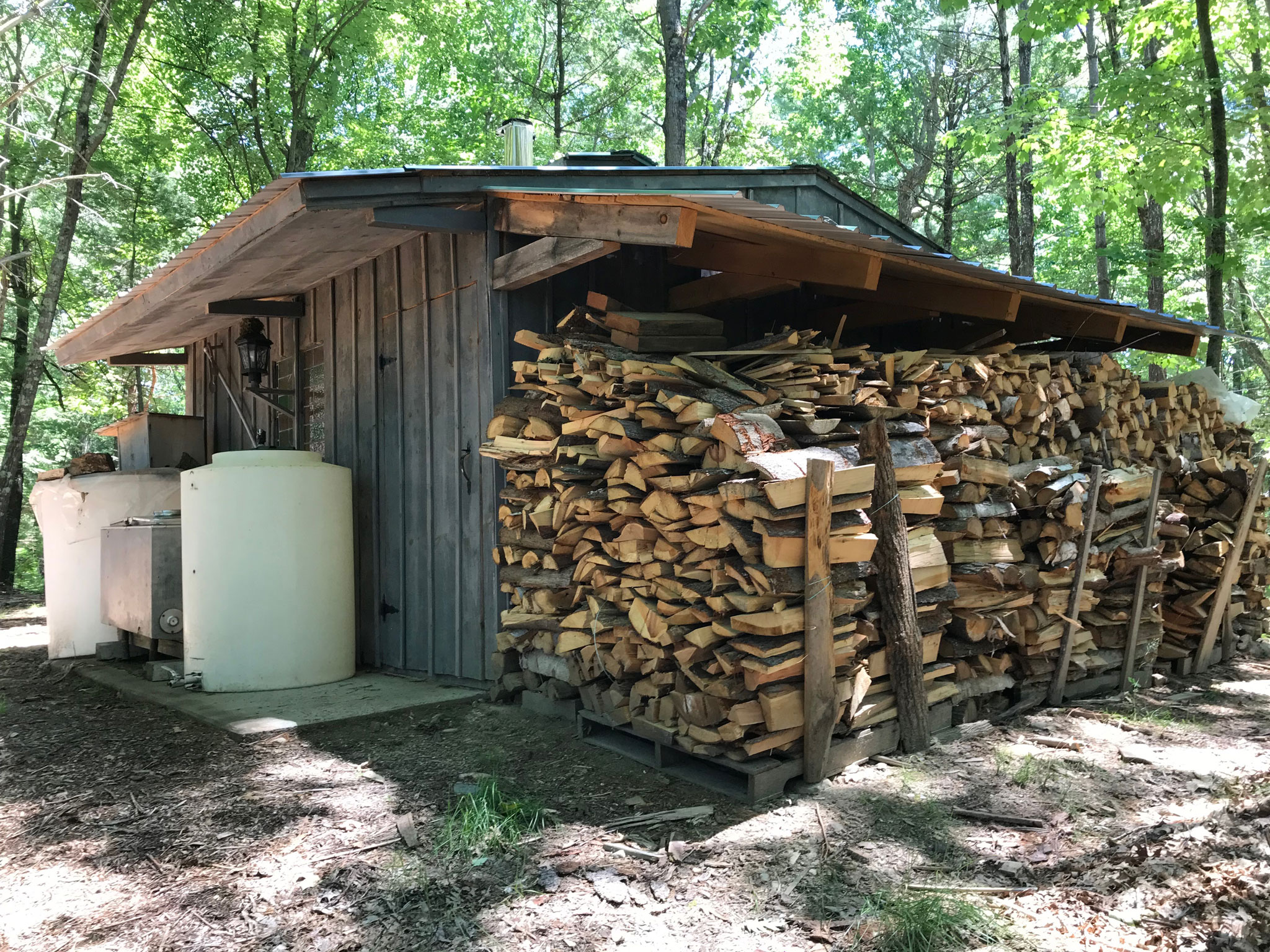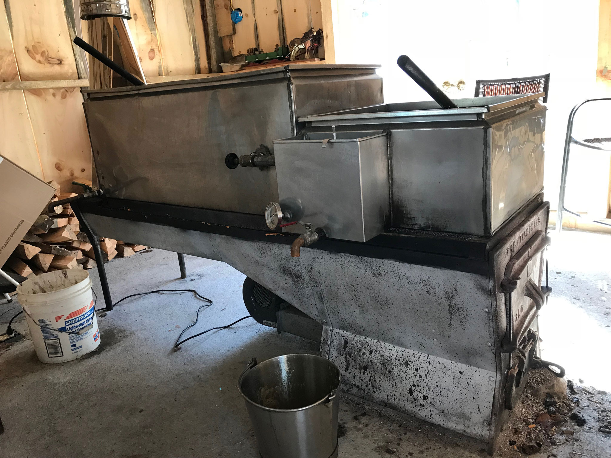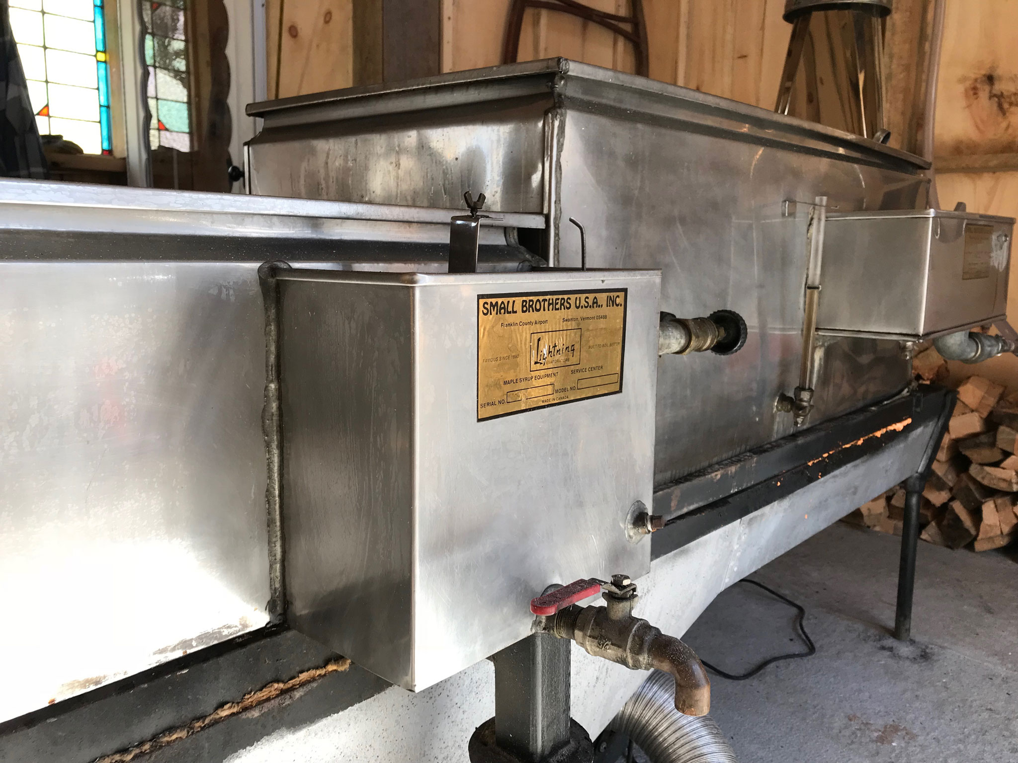 We out-grew the old sugarhouse and decided it was time to mill the wood to build a new one. It needed to be big enough for a heated room to accommodate our new RO and have more access around the Small Brothers Maple Sugar Evaporator 2X6 (Lightning). The evaporator is wood-fired with a raised flue. The syrup pan is 2X2 and has 4 compartments and is able to draw off on each side. Matt designed a blower fan for it facing the loading doors and the front pan for hotter heat.