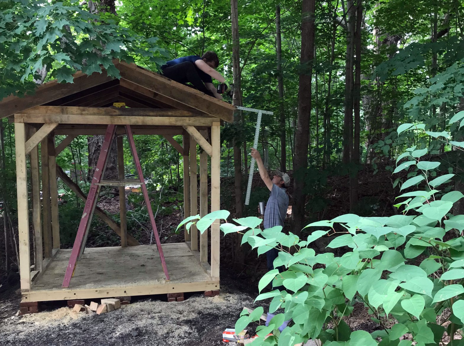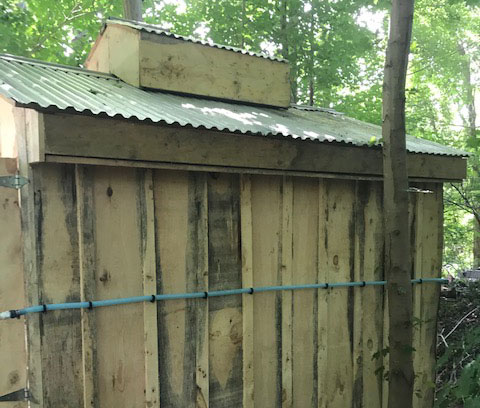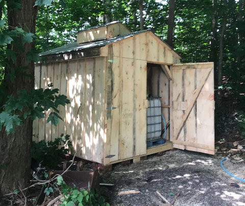 In August, we built a pumphouse to gather the sap. It was designed to look like a sugar house and holds two totes for collecting the sap.